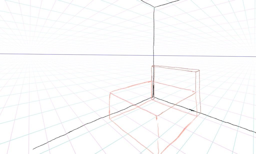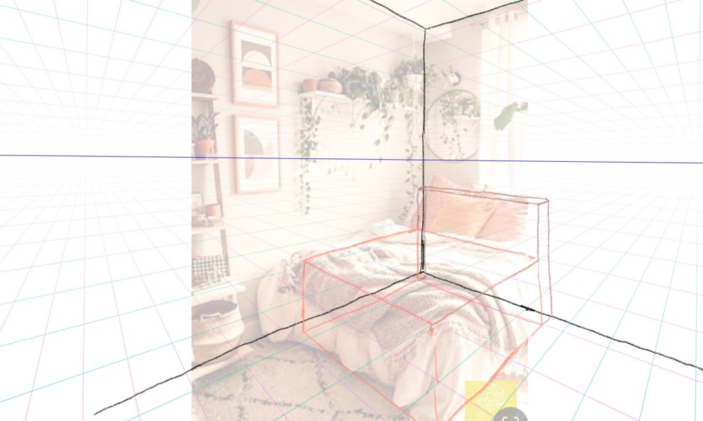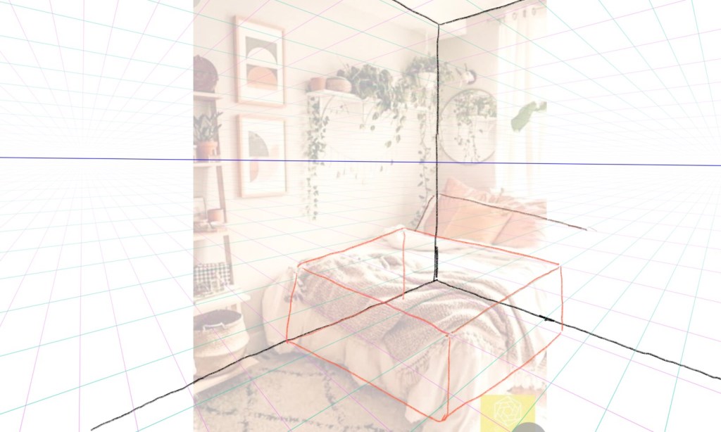Next I tried to draw the bed in the corner but using the perspective grid as a guide, to create a sort of ideal conforming shape.