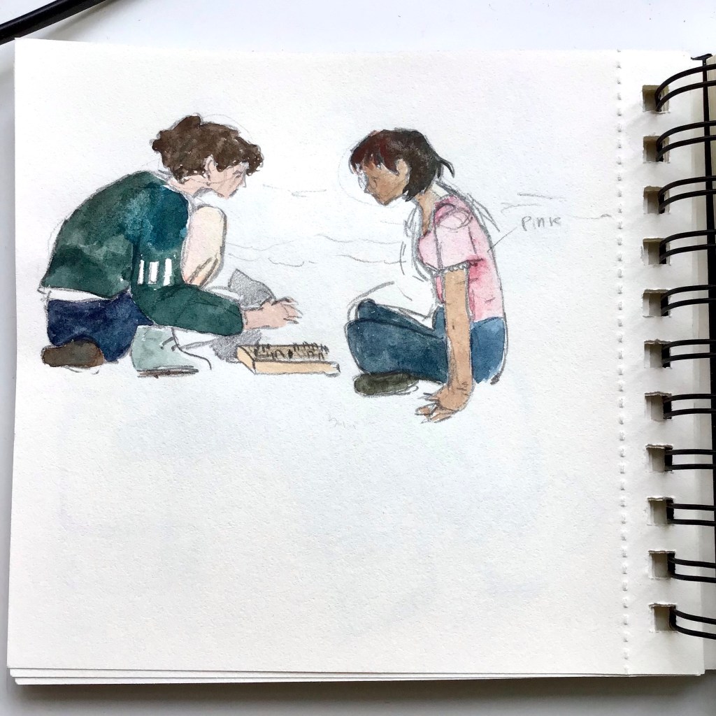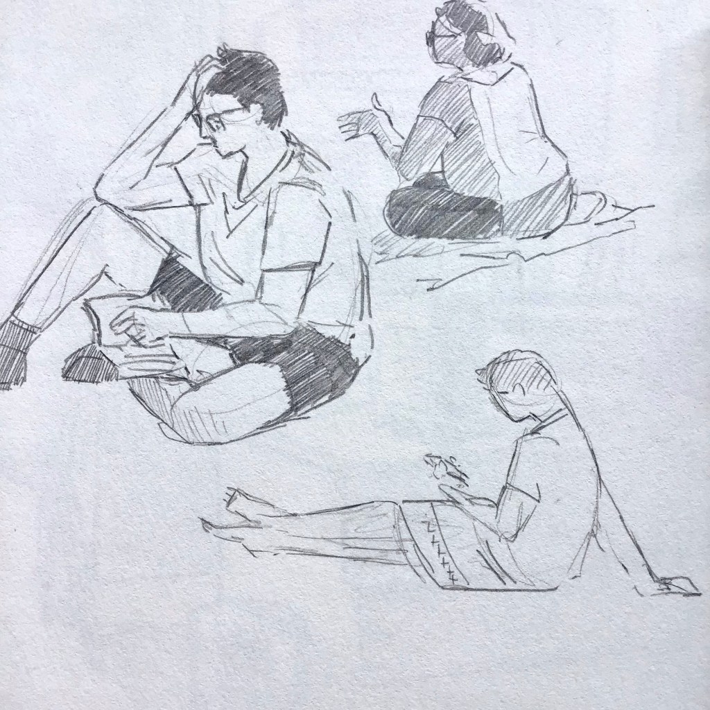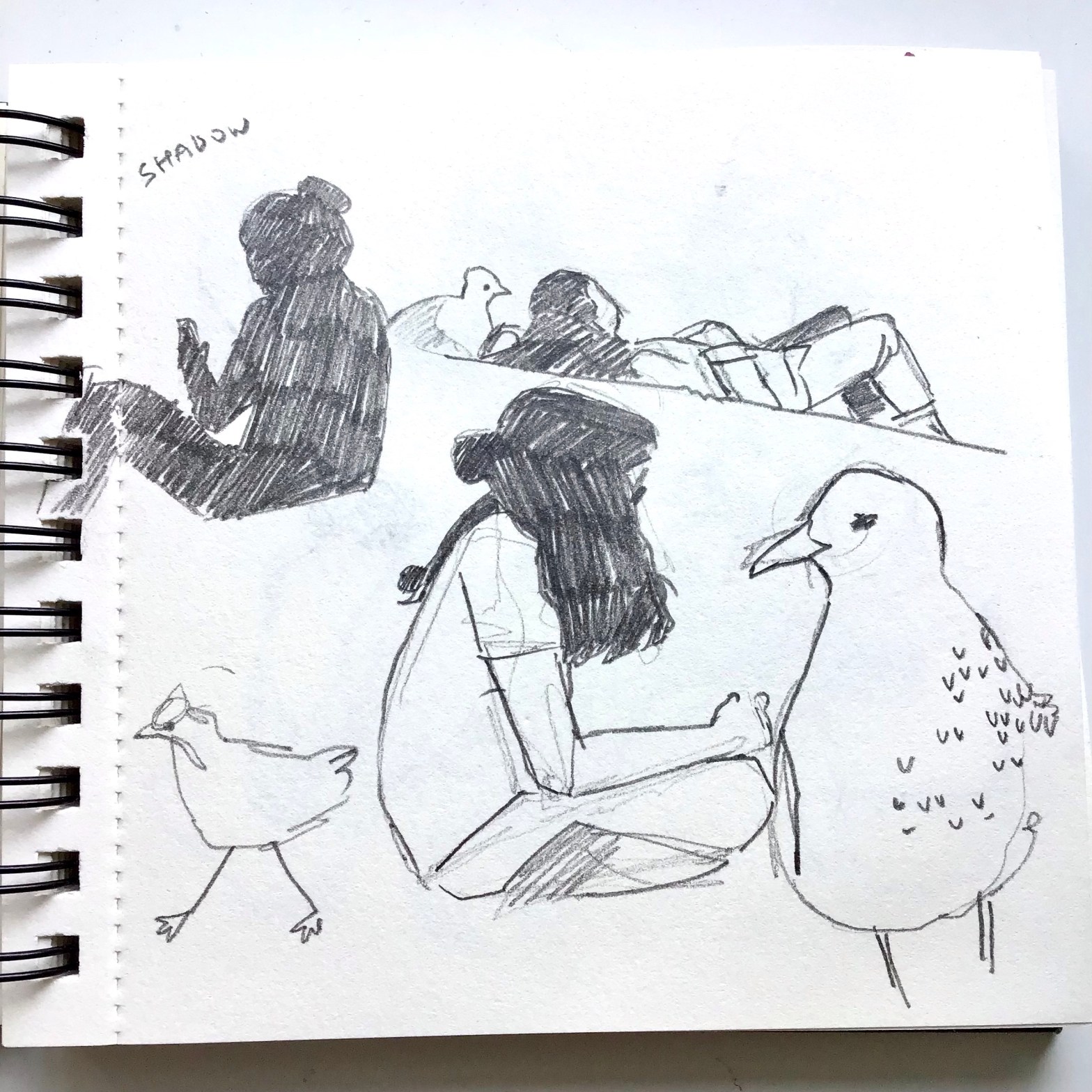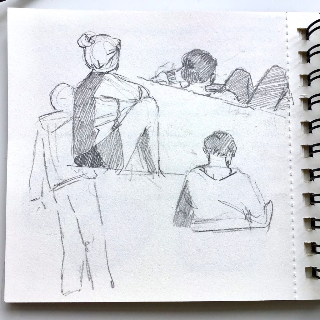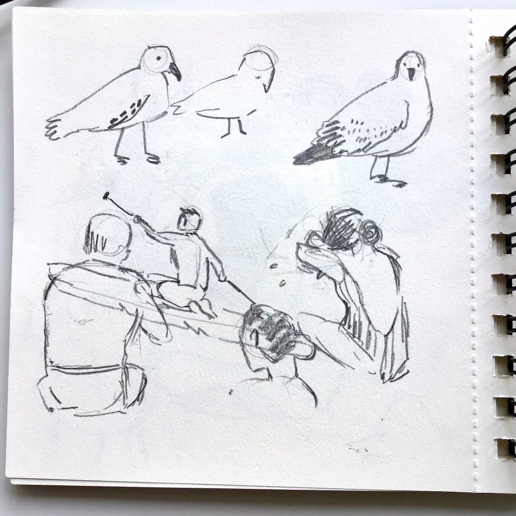 1. People watching. I love going down to the sea with my notebook and sketching people I see. I need to start taking my notebook to different places, because I am finding that I’m getting people from only one real angle – behind! However, it is still really interesting and useful. I like trying to capture moving people.