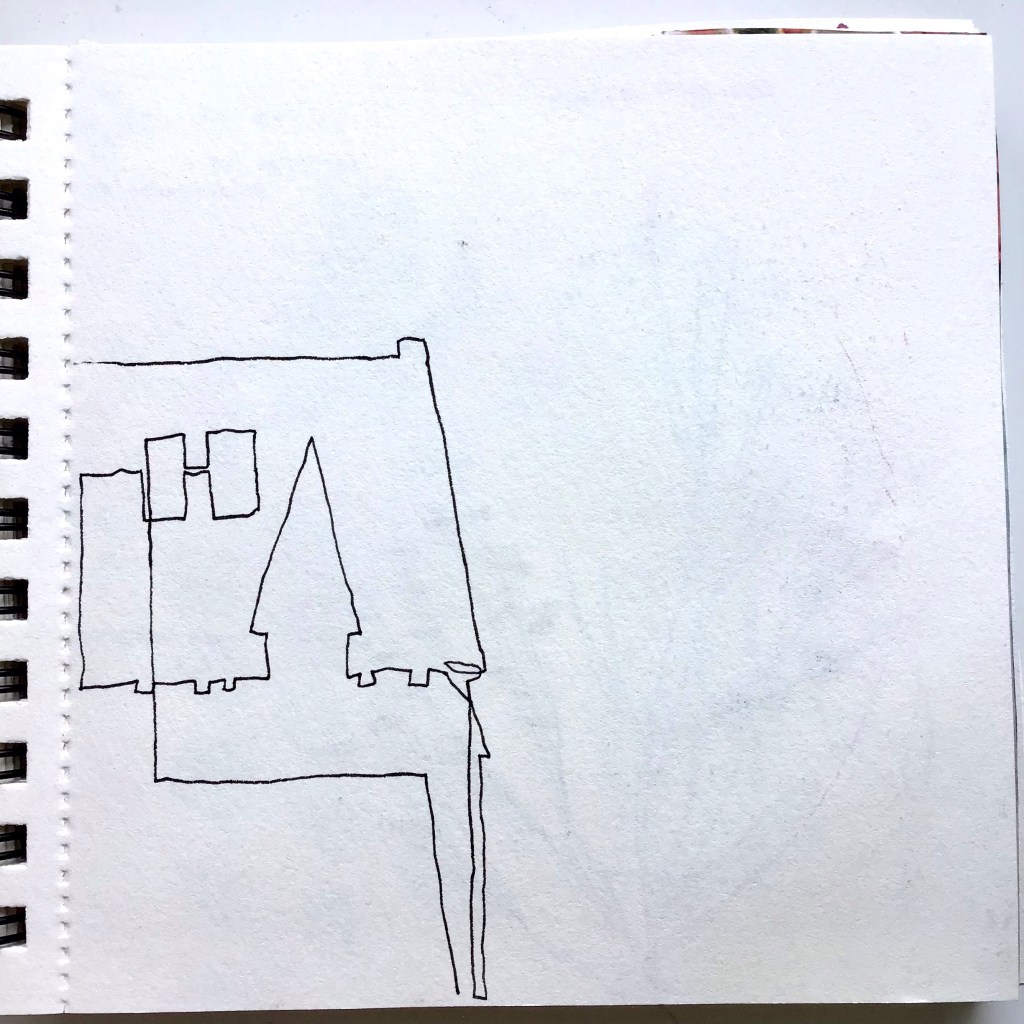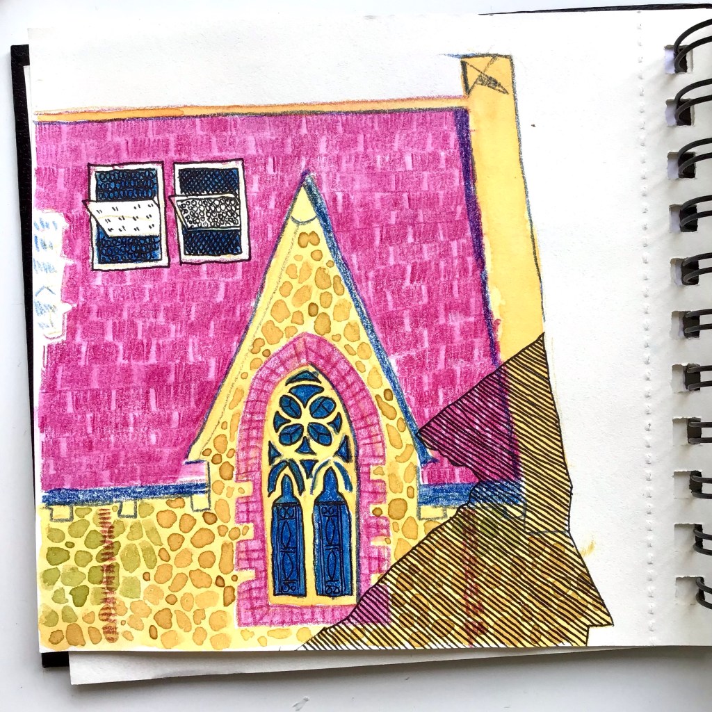 2. Intense / Minimal. You can see in my drawings of the church early on in the sketchbook I created two iterations. One was full of colours, layers and textures -and I tried to keep to bright hues to fill up the brain when you look at it. The next page on the spread is a single line drawing in which I have tried to reduce the building to its simplest shapes.