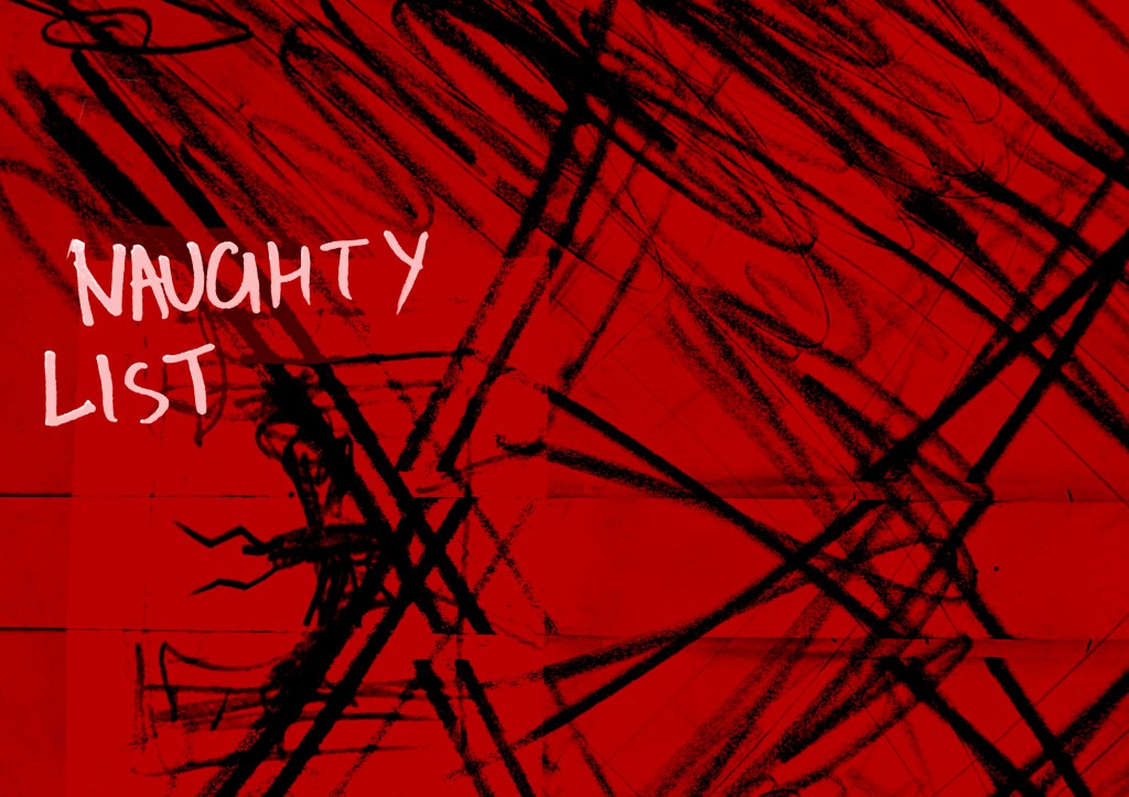 I thought nothing, if not “har har”, when I wrote “NAUGHTY LIST” in response to the text. I’ve thrown it on the front cover because I think it becomes clear quite quickly it’s about hell, but you get that juxtaposition of Santa and Christmas, which is quite fun, and sets a tone for a hell-based zine that’s not taking itself too seriously. Makes the reader work a little.