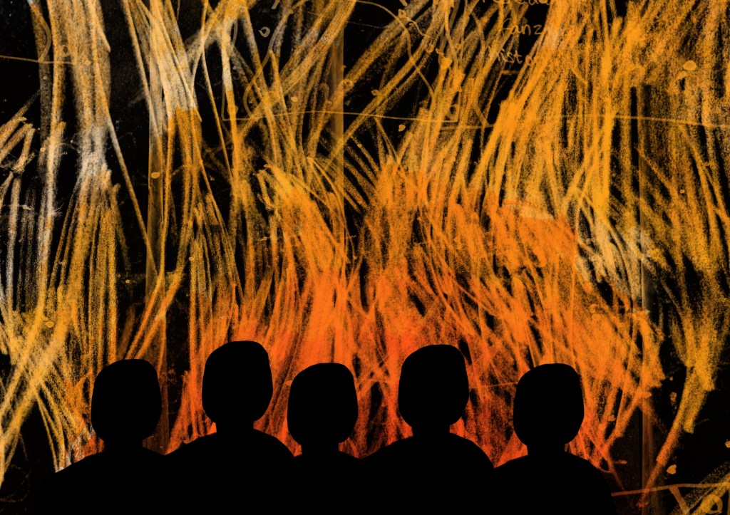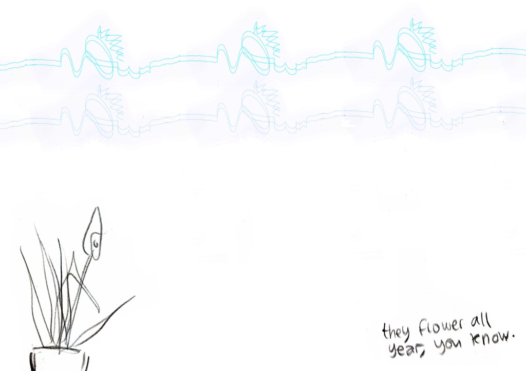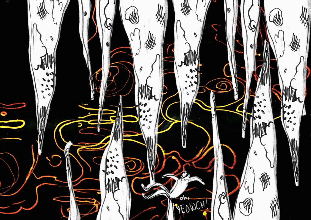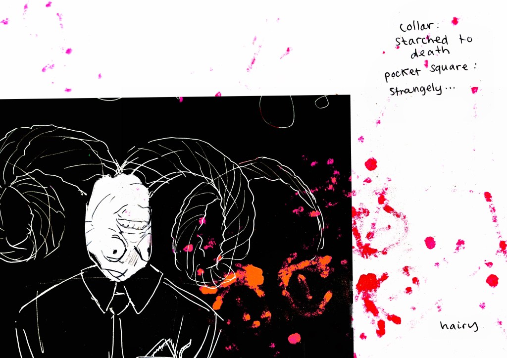 worked on the quite fun idea of patterning the demon’s suit with some of the penwork and drawings I’d made. Proud of the way I managed to get all the marks to interact with this one. This one, as with many of them, rely heavily on mistake and chance, which I like. The spatters are where marks have bled through another page of newsprint. The demon’s face was quite tightly drawn, but the erased face with a screaming one behind it is quite effective, I think. really into the atmosphere I created with this one. I’ve been trying to take an interest in patterning and repetition since observing far more of it than one would think in real life. I particularly noticed it at the Grand Hotel, in the architecture: even if you don’t register what the pattern is of, the repetition is pleasing at first glance. The hand breaking through the repetition and the anchoring of “PEN STEALING HELL” make this one successful, in my opinion.I decide in this moment that I prefer this image to the one above. The silhouetted heads respond more directly to the text, referring to the five terrified souls looking down on what Hell has to offer. The background was copy pasting my hellflame pencil texture a bunch, slapping them on multiply, inverting it, and colouring on a – probably a darken layer or something similar. I think the marker bleeds look like sparking embers. Actually quite fun and effective.I think they’ll never get me to relinquish text in my illustrations again. I’m surprisingly pleased with the background here – created similarly to the flame texture above. This is weird, but I get a real sense of depth with this one – like there really is three-dimensional space between the stalactites and mites. This was my favourite of a series of at least twenty marks trying to capture what a grating squeak on a metal chair would sound like. Again playing with patterning and colour, but I took the mark further below – as this page is visually pleasing, but didn’t really add to any narrative.Suddenly remembered the “two rows of fluorescent blue tube lights” along the office ceiling, and created a spread inspired by the cleanliness and whiteness of the office. I think a proficient demon with this mild interest in the plants – that’s a peace lily – enough so to mention this fact to the souls coming into the room – is a funny one. I also think that this laid against his complete apathy (or even enjoyment) of human suffering makes him even more terrifying and unpredictable. Hugely into this one, and this – again – was a child of mistake and inaccuracy. I focused in on phrases about the lava being like sweets, molten candy, molten sugar. I just think the tone and colour as well as the way the marker reacts organically with the colour and background make it really cool.