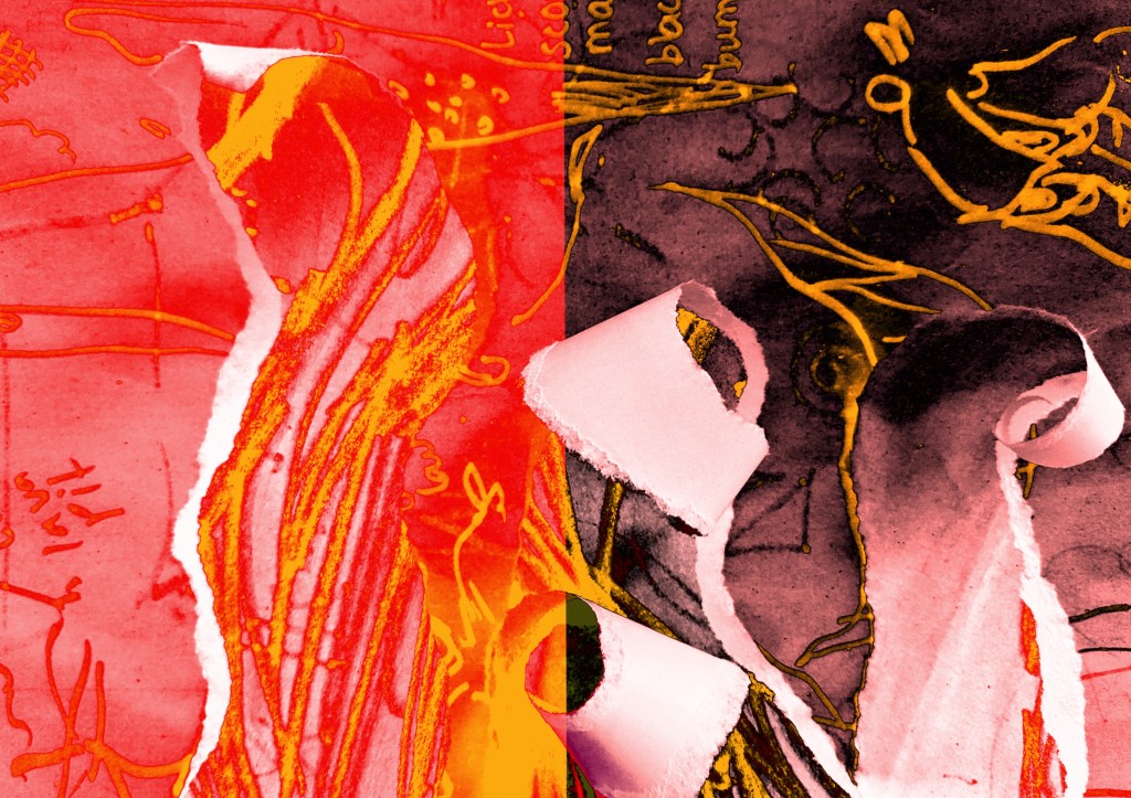 This spread was inspired by Jim’s composition on the screen. The full bleed laid against the nice, framed piece is interesting to me.Playing with layering effects that would look cool across the central fold of a zine. I see a face in the torn paper and the mouth.