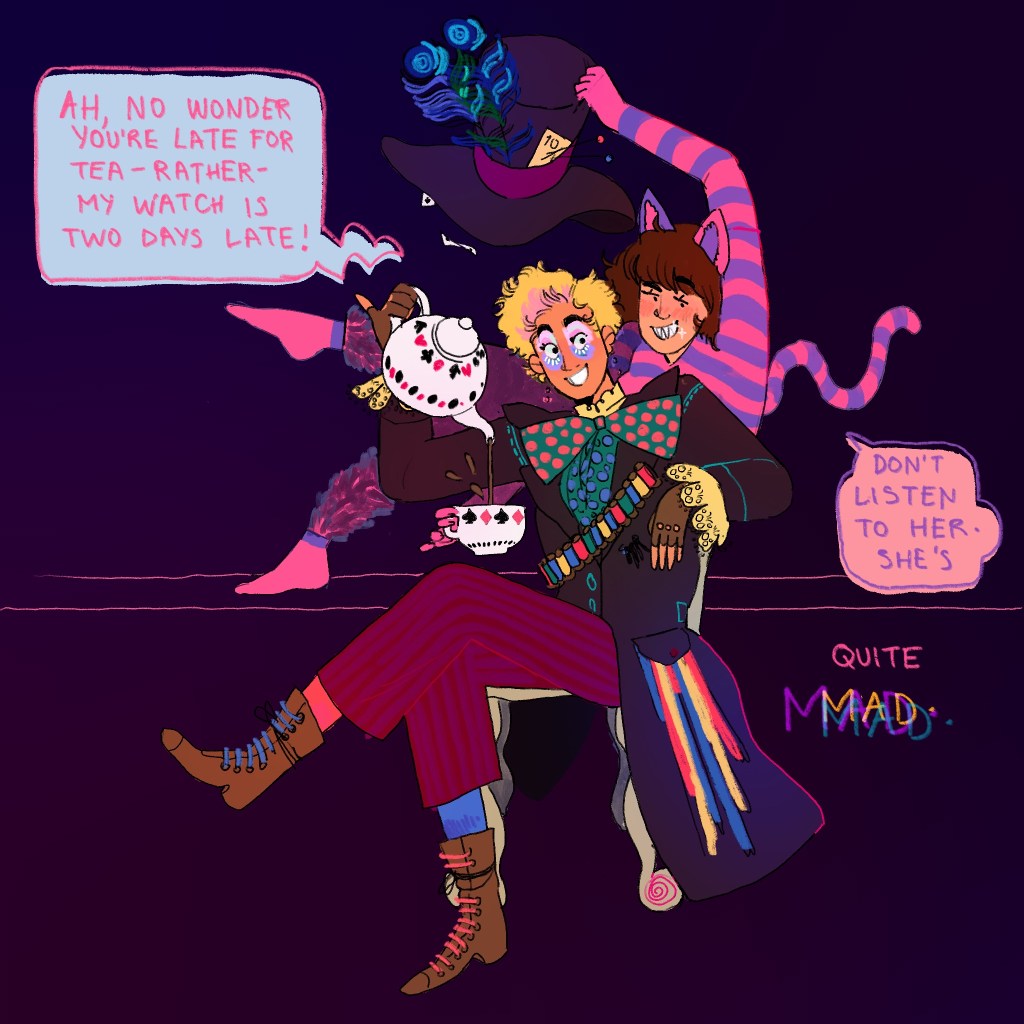 The mad hatter stayed impressively in character, and he really was batty. The Cheshire cat was a contortionist. Seeing real people (theatre kids) acting wonderland characters made me think of Antonia and how good she’d be as the mad hatter. HOW haven’t I drawn her as him before? (Spoiler alert – I almost definitely have and have since forgotten).