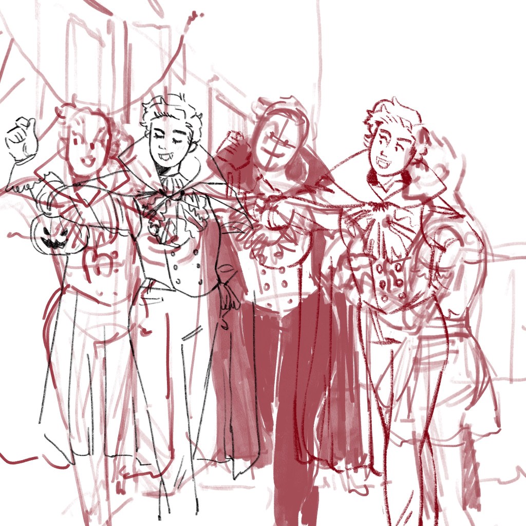 Sat down after a couple solid hours’ housework to draw Drake and Antonia in their classic halloween outfits. Did warm up drawings of the view out of my window to get my eye in and scribbled a bit to loosen up my hand. Found a good reference and made a good sketch.