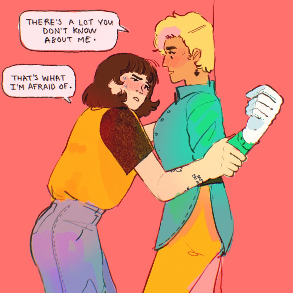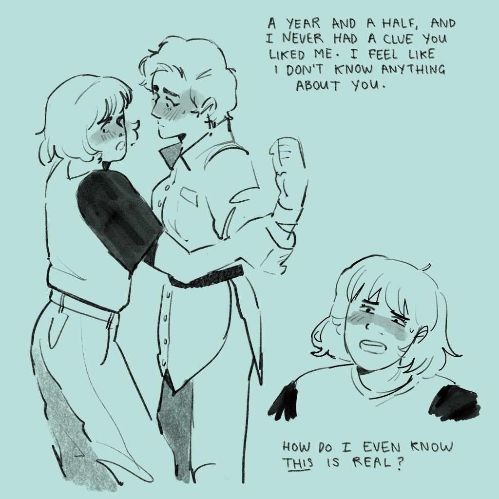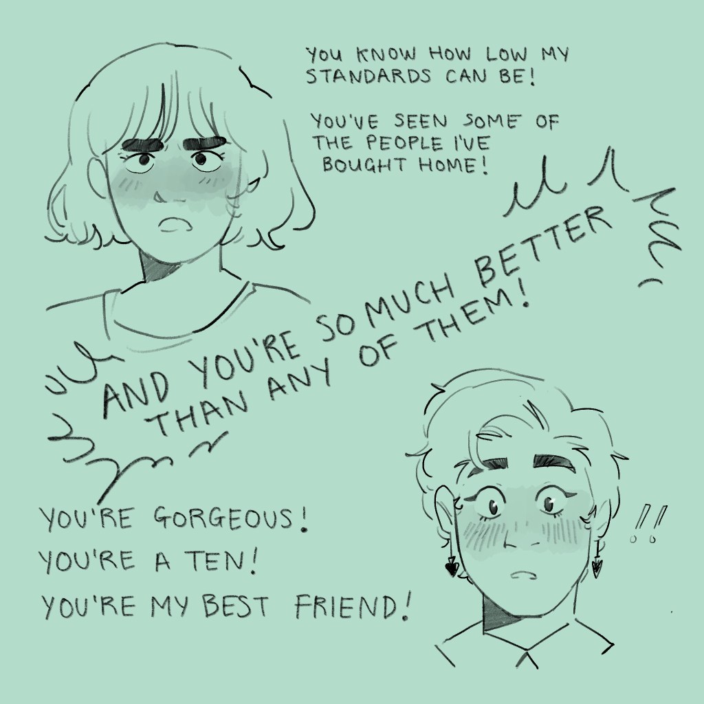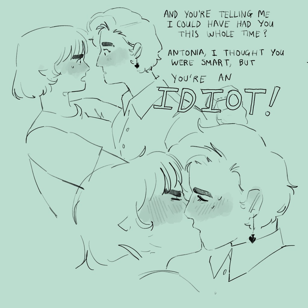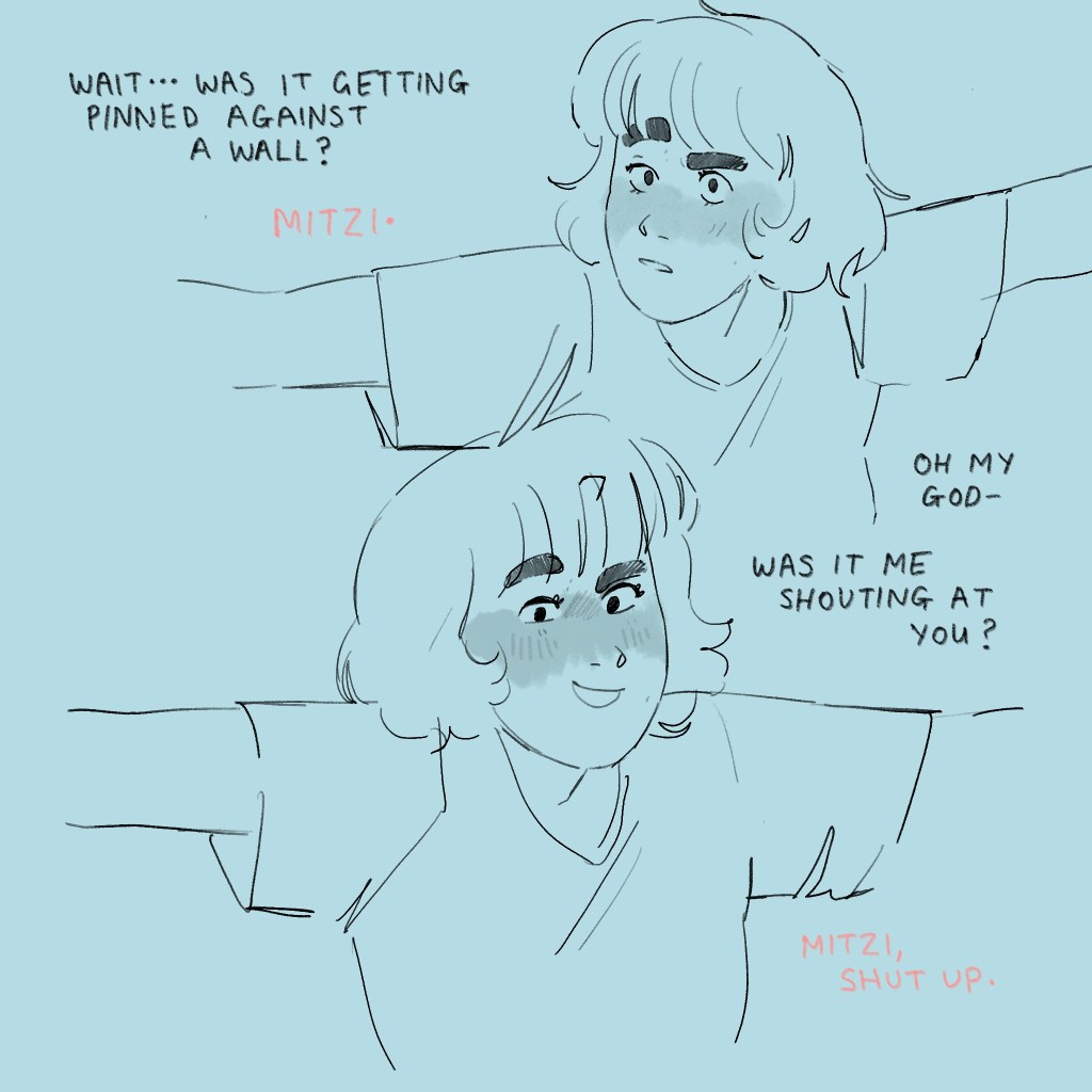 I’ve drawn kisses (and, indeed, interactions in general) since time began, and I’m happy with this one. I think I’ve indicated where the force is coming from (pushing upwards, through Mitzi, since Antonia is against a wall anyway) and I’ve smashed that emotion with that angsty little eyebrow and the crinkle in Mitzi’s nose.