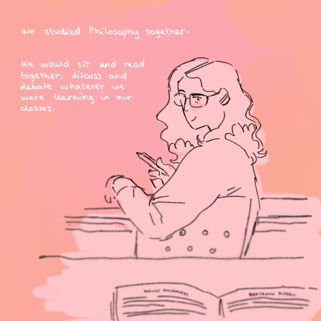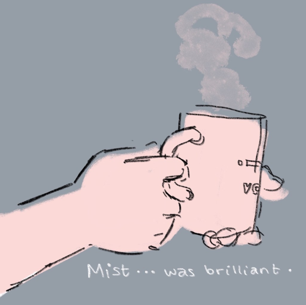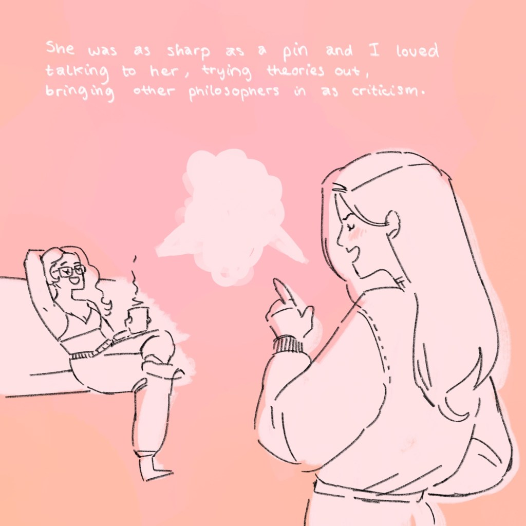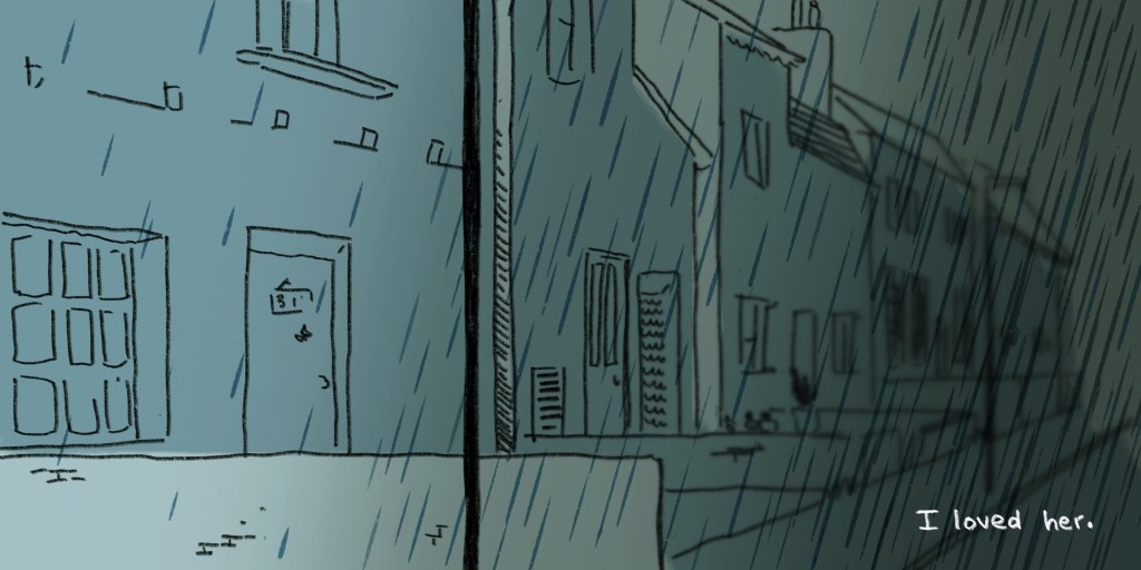The colour changes and becomes quite cloudy and pink, and the monologue becomes descriptive. This should indicate that we’ve moved to a memory, introducing the reader to the tool of decoding pink as memory and desaturated blue as present moment.