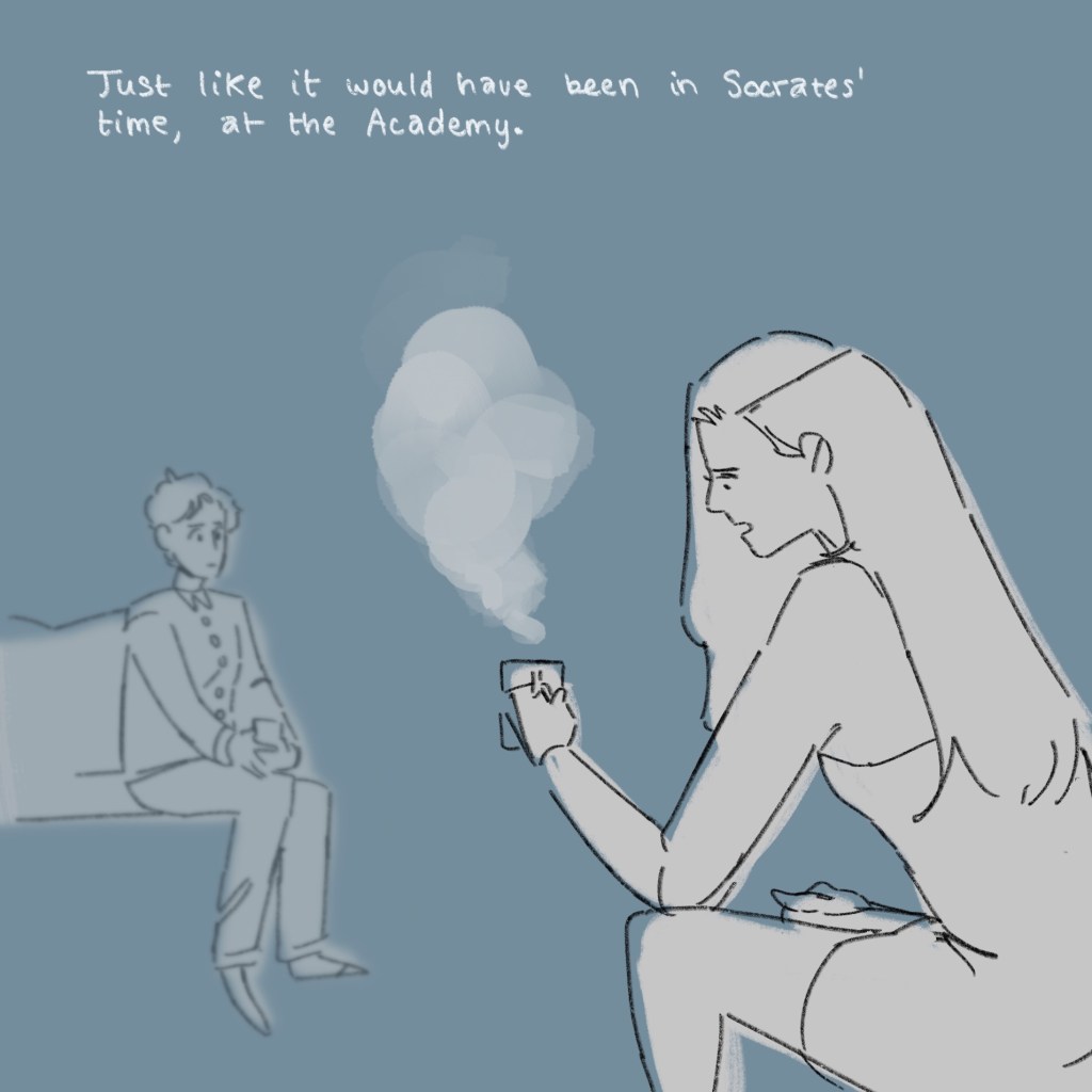 The composition of the second and third panels are almost identical, making a sort of graphical cut between the speech bubble and the steam coming from the tea. This takes us from memory to present in a cool way – I see the memory almost melting away as Techo comes back to the present, seeing Antonia sitting across from her, but still fuzzily, still deep in thought.