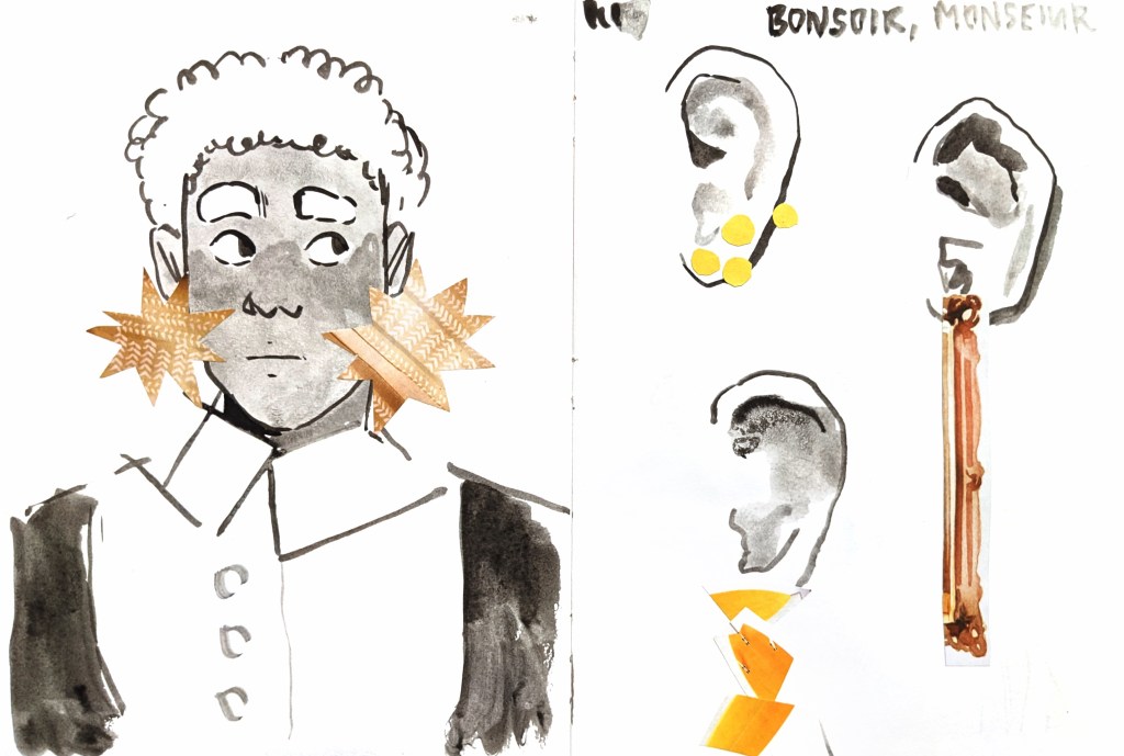 Gold and sun themes and yellow really suit him. I collaged a couple of yellow earrings to riff on the theme.