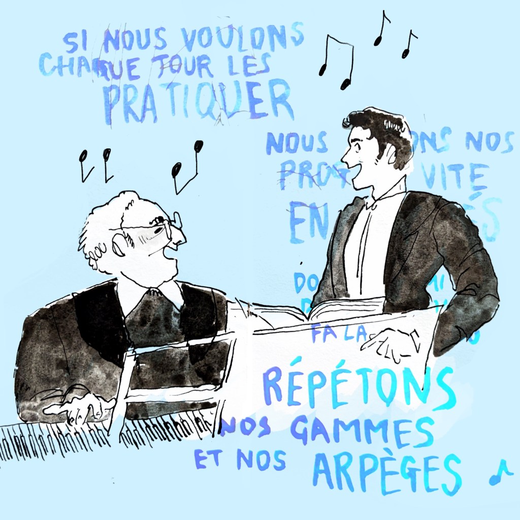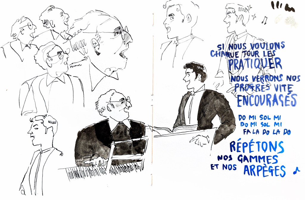 This spread was going to be about Drake and Antonia, still based on the French Scales and Arpeggios, but I found an endearing reference of two people at a piano. I used ink to do some tiny blind drawings, and then some mini studies, and then put the reference away and used the shapes stored in my hand to recreate them with character.