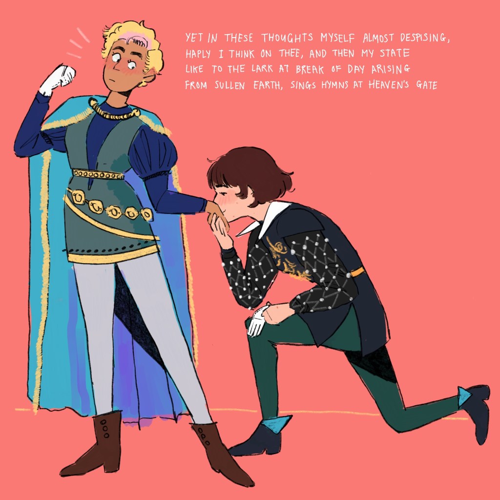 Outfit inspiration taken from Court Jester outfits. In the Kingdom!Au, Mitzi is King and Antonia is a jester – so the dynamic of Mitzi kneeling to kiss Antonia’s hand has me absolutely reeling.