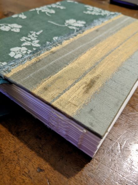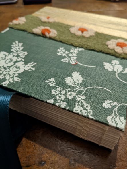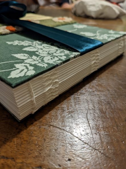 If I bound this again, I would use thinner thread on the signatures, and possibly sew even more signatures on. A book this big needs width to give it presence. I was surprised by how well the fabric stuck on using heaps of my tacky glue, because I was really expecting that to be the miserable part. Even the thickly knitted white flowers stuck quite easily.