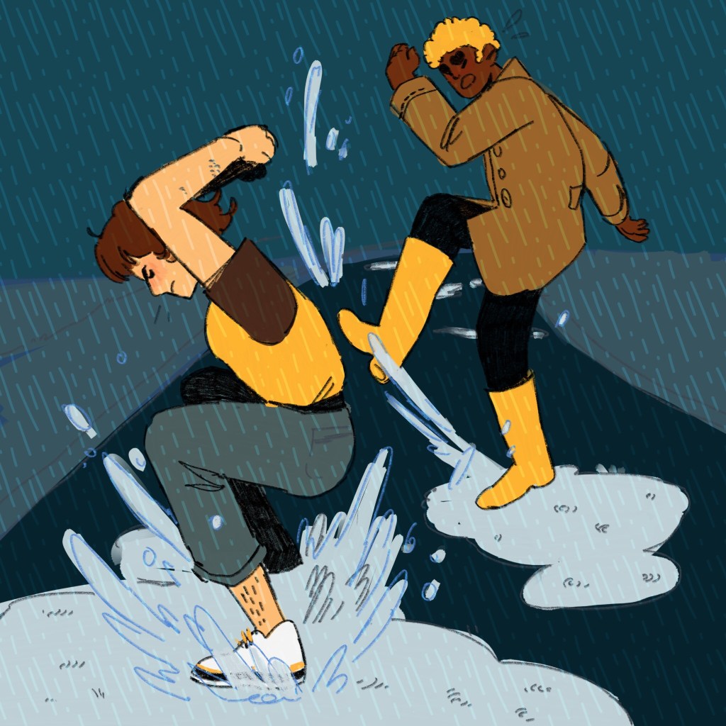 It’s not finished but it is coloured. I threw an orange soft light clip layer over the characters to bring an interesting interaction between the blue background and the life in the people. They’ve had weird days. They’re getting their anger out. Techo joins in immediately.