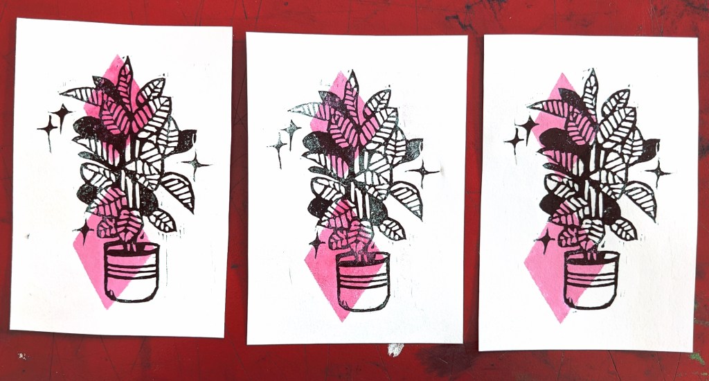 Anyway, I used an old lino cut I’d printed of a fig houseplant, and quickly laid down some diamonds in pink sponged paint. I wasn’t expecting good results, but they came out really well!