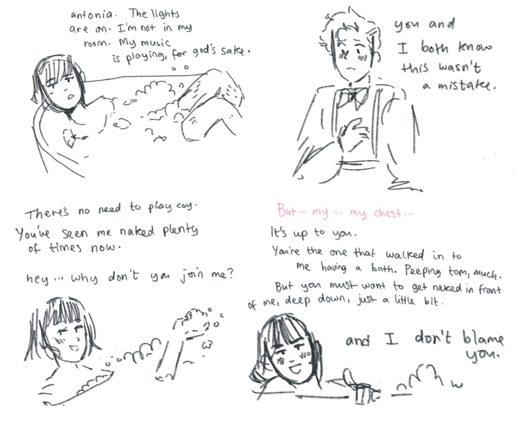For context: Antonia and Mitzi have been together for a couple of weeks. Although they’ve done a few sexy things together, Antonia has been loathe to take off her bra or underwear. She’s transgender and conscious that her body doesn’t match up to how she sees herself and is seen.