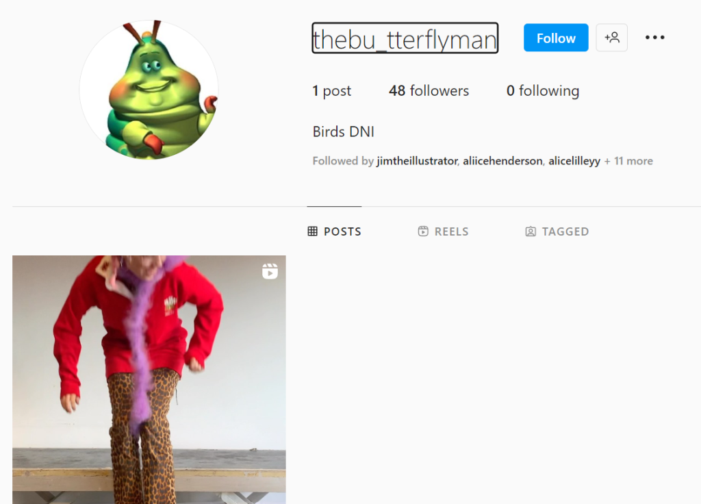 We created an Instagram account for the project, @ thebu_tterflyman . Tia was right on it with the account creation!