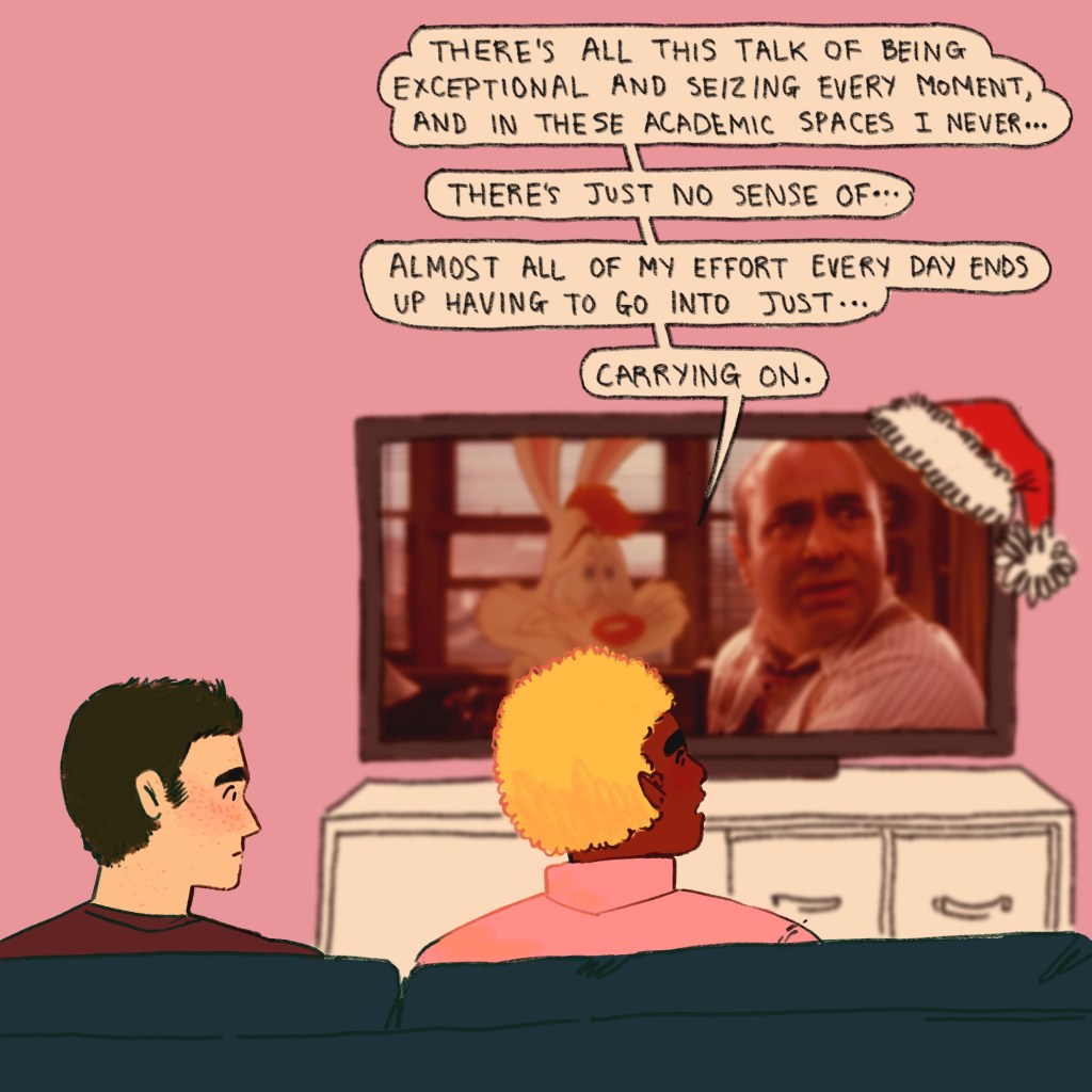 There is an explanation for all this. This is right after they’ve cooked for the household. Techo insisted she wanted to stay up downstairs, and asked that they watch Who Framed Roger Rabbit. The boys concede.