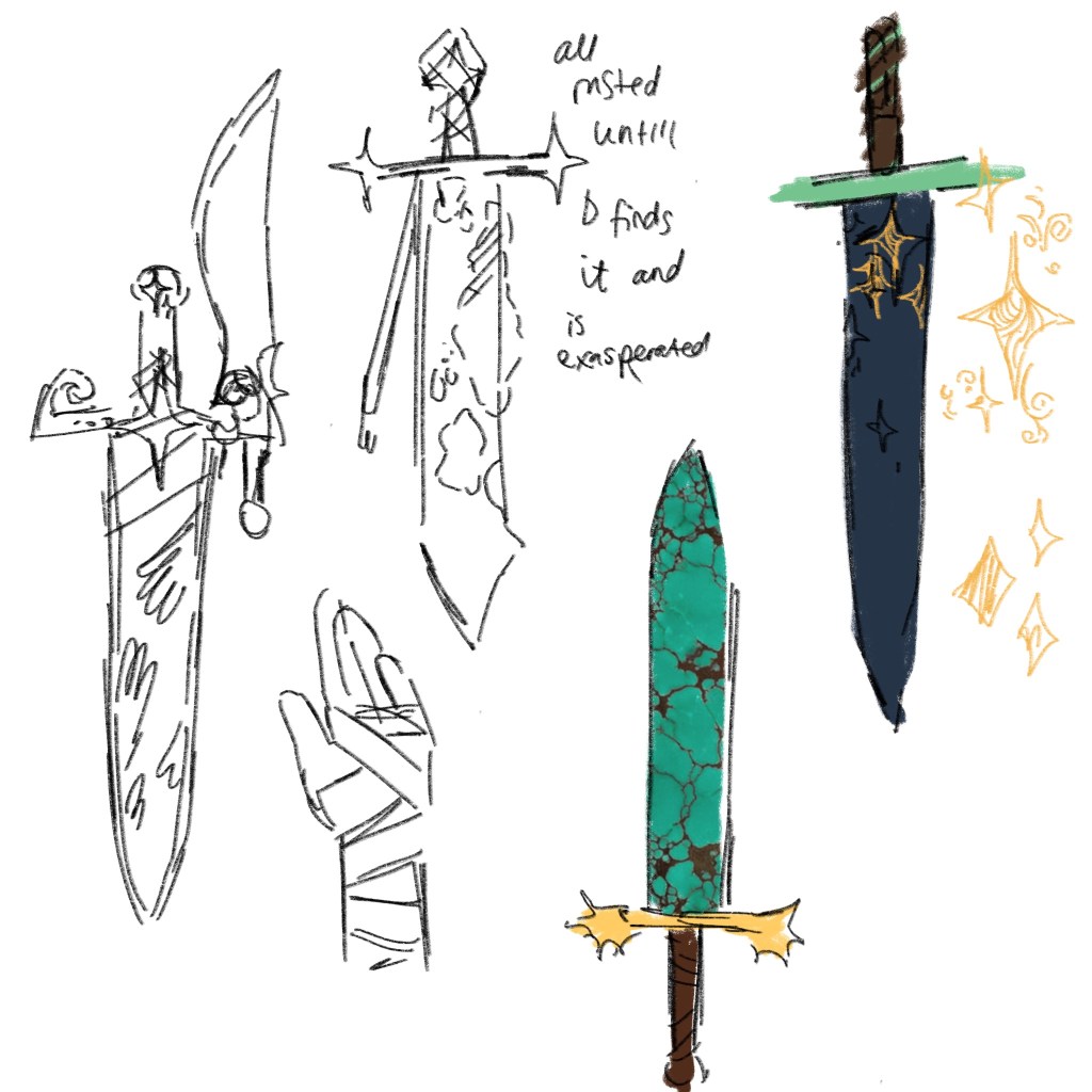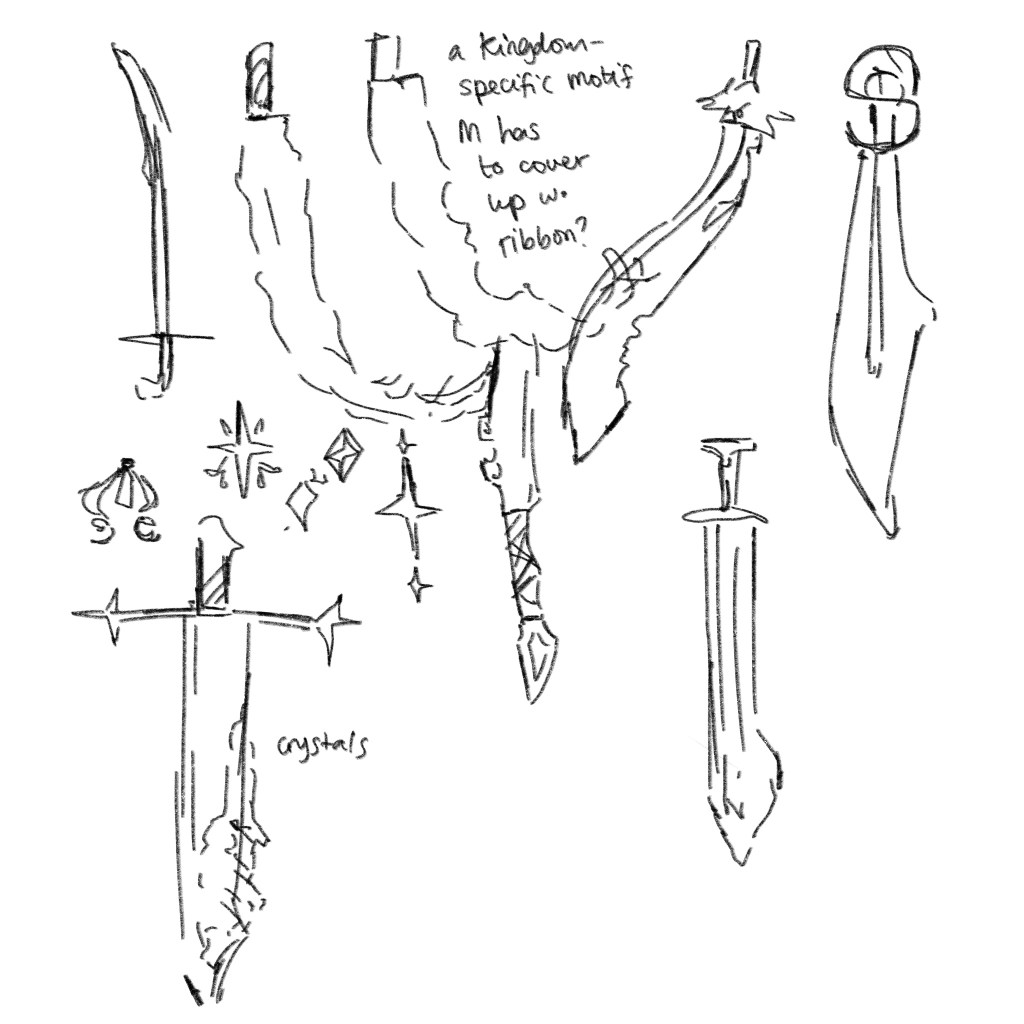 But you can see I didn’t know what the sword looked like, and this sword happens to be a priceless royal heirloom of mysterious origin that can talk (but only to people of the royal bloodline). So… its design was pretty frickin important. The task of the day changed! We begin to design swords!