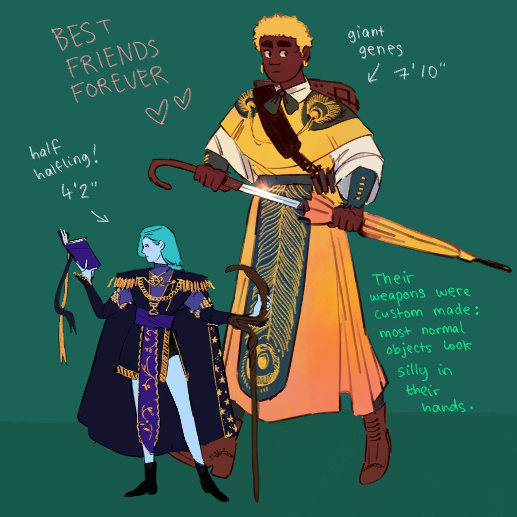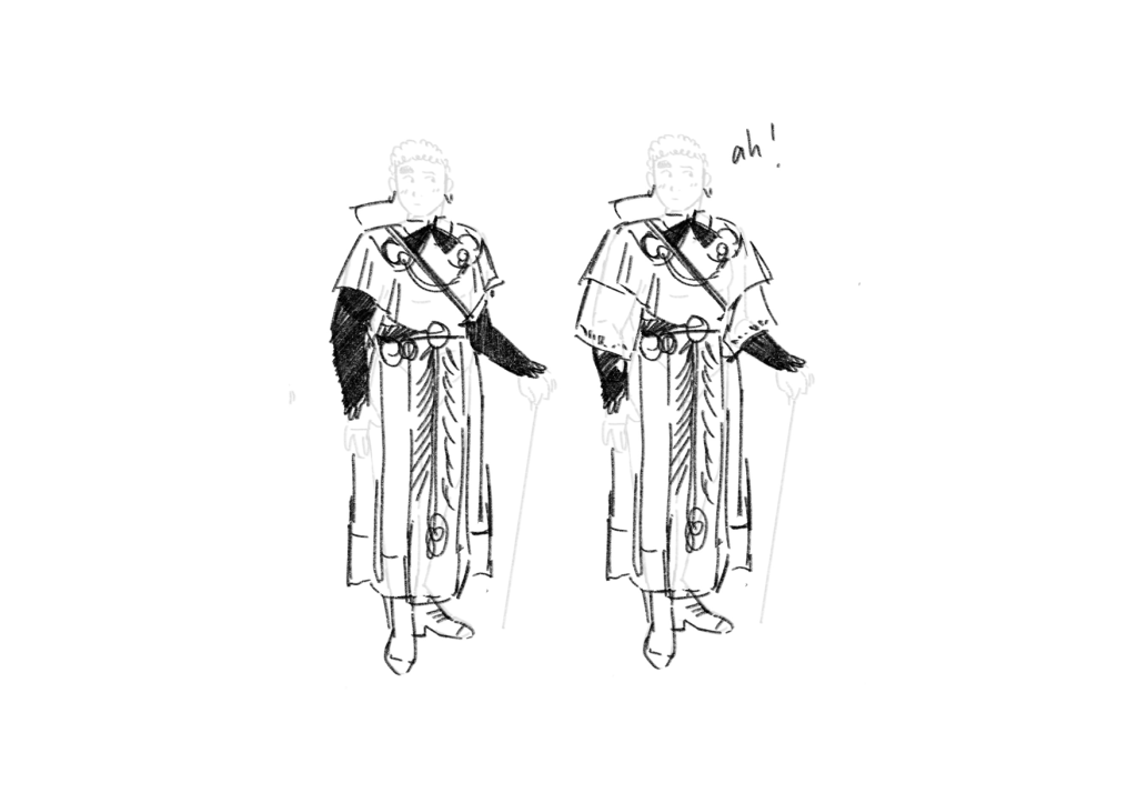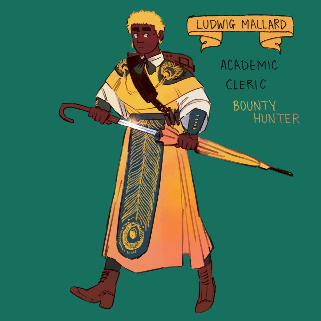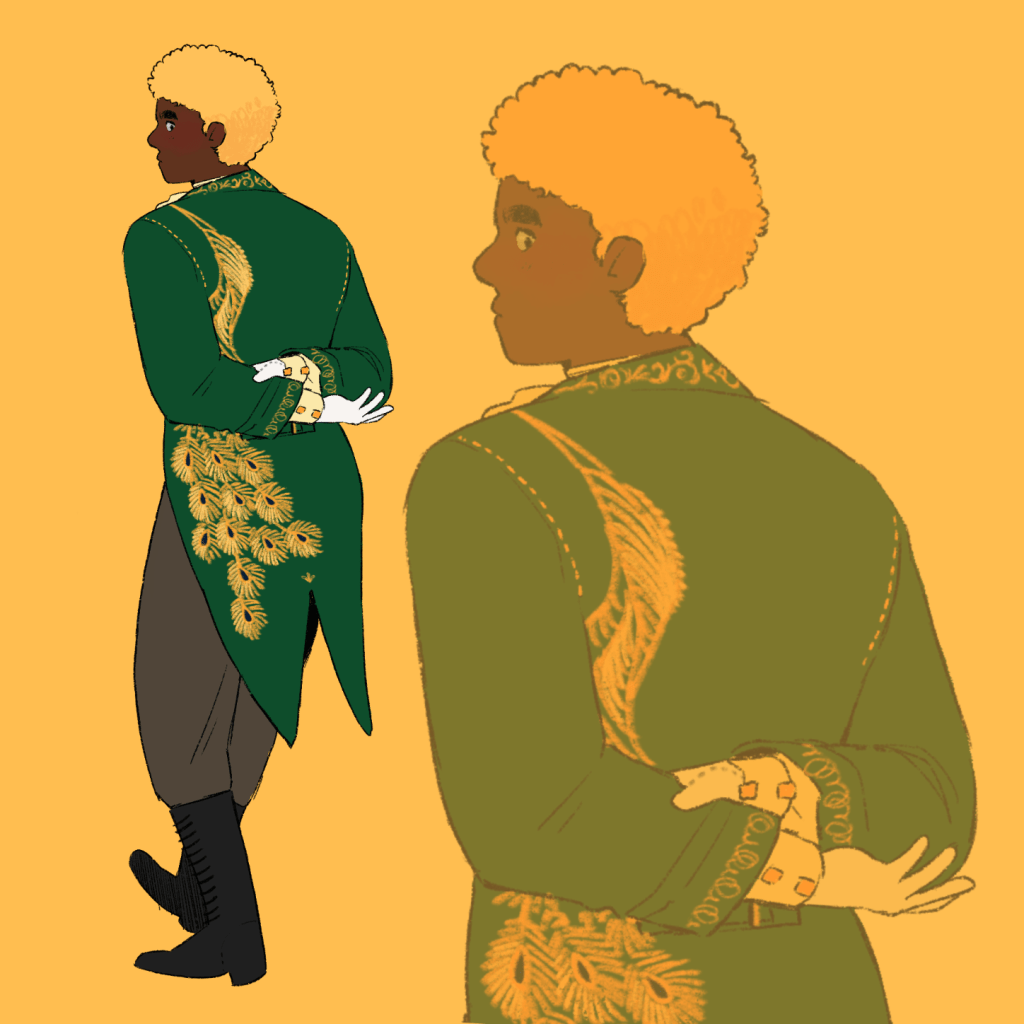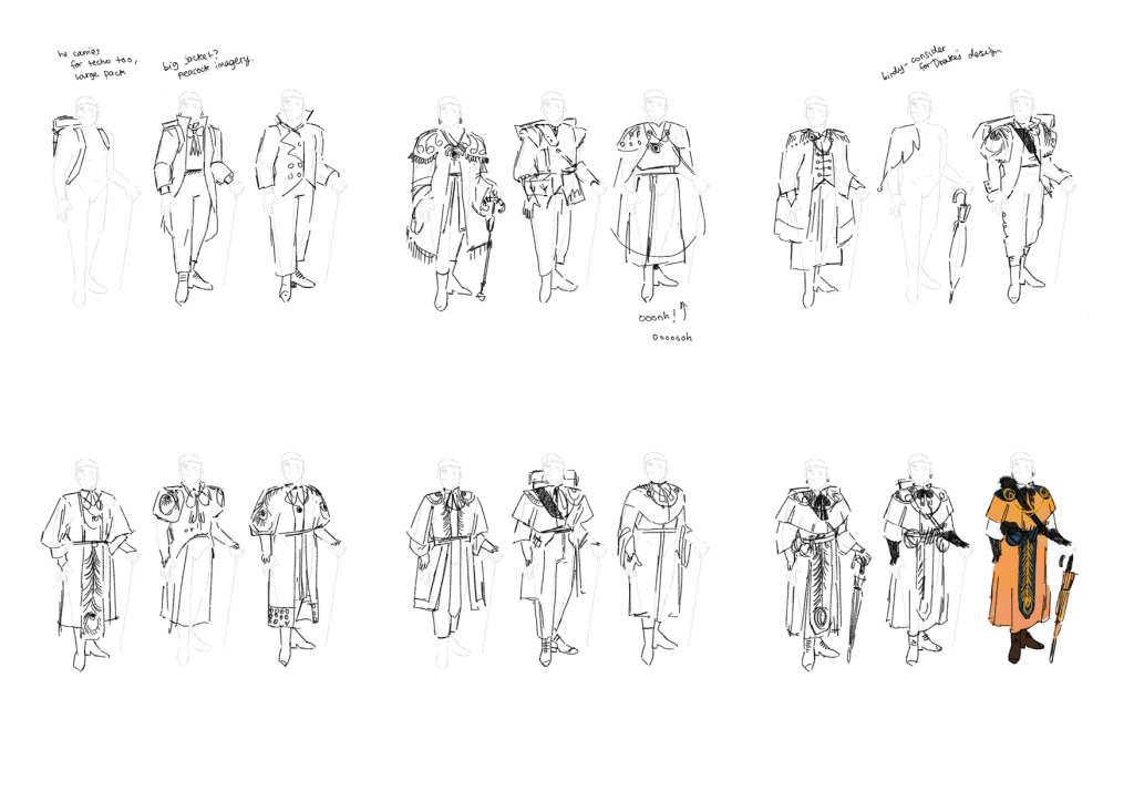 Ludwig’s colour has always been yellow. His shape language is heavy on circles – he has a round face, a round, soft torso, lots of curves. I pushed this in my designs through the circular tabard he has, circular shoulder pads, and circles in the peacock feather logos. Ludwig has close ties to fashion through every universe. He adores wearing fancy things, and this makes his design that much more important, because he would have put a lot of thought into his daily outfit (unlike Mitzi, who’s outfit was designed specifically as something she had to cobble together from bedclothes and stolen shoes, as per the plot). All this to say that the peacock motif works because he takes pride in his appearance, and it’s a bit of a decadent, golden icon to work with. I worked up a peacock outfit in the Jester AU – hmm, can I find it?