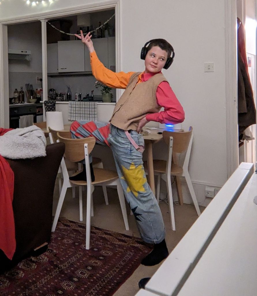 The start of this one’s progress was me dancing around the room to some new music my favourite artist released. I was in a dramatic mood, and I took lots of pictures of myself in different poses. I include the most successful one below.