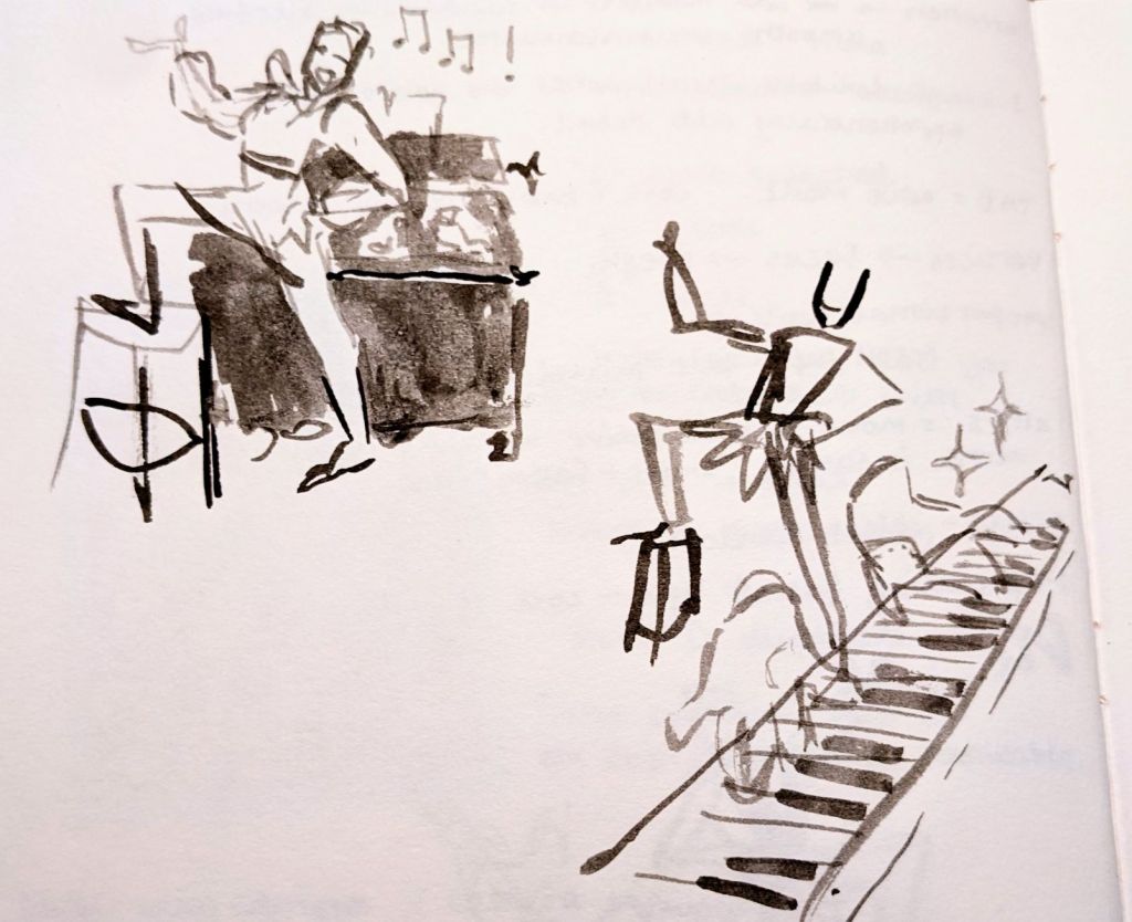 Here’s the ink thumbnails I did! I needed to keep the gloves front and centre, and the bookshelf that crept into my little reference pictures served as perspective inspiration. Funny where these ideas come from!