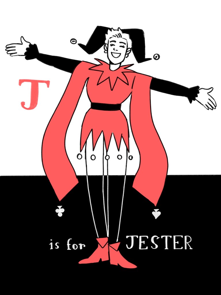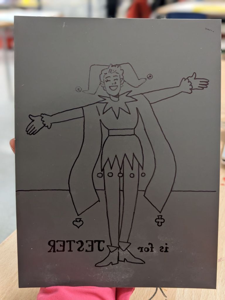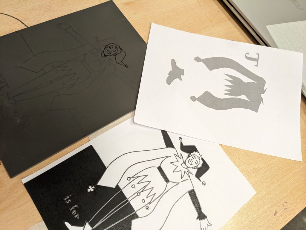 I mocked up my Jester as a final image in Procreate. This featured two layers: the lino layer, and the colour layer underneath. I saved both and uploaded them into indesign at exactly the same size, to use as guides to creating stencils and lino.