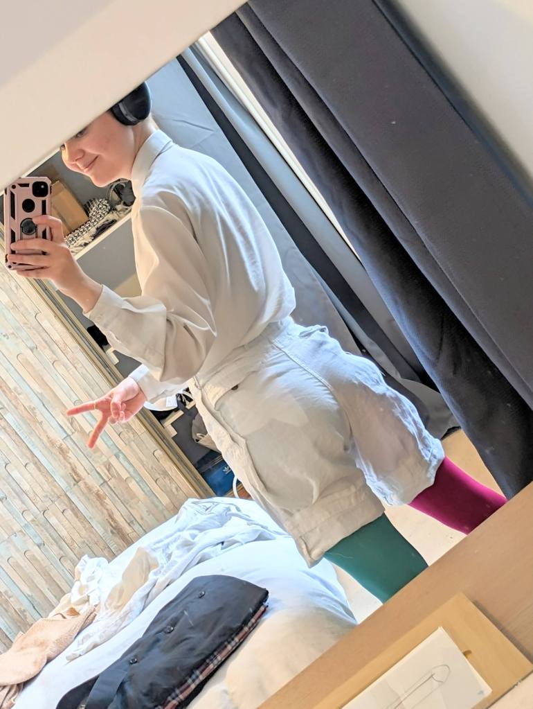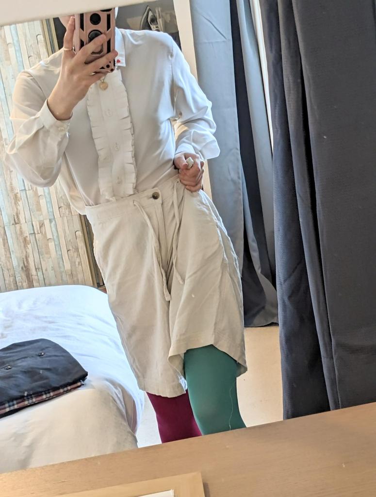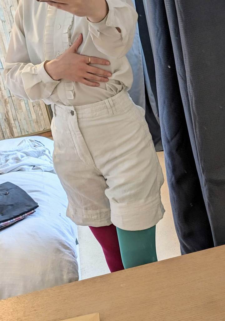 And there is the after! I took some off of both sides of the waist, managed to keep three out of four of the pockets (NOT easy) and also managed to fit it perfectly. I like this length: it reminds me of shakespearean puffling pants, especially so well fitted to the waist.