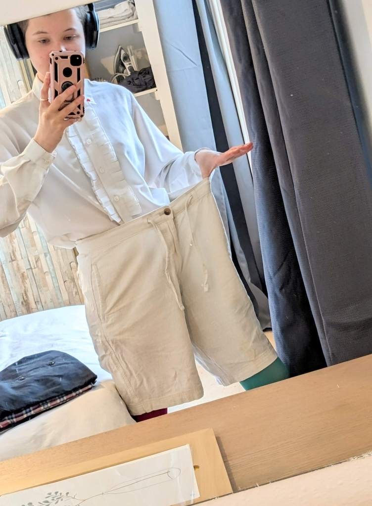 Today I threaded it up for the first time and messed about with my boyfriend’s dad’s old pair of shorts. These were M&S Men long shorts, but in lovely cotton. I had always just tied the waist very tight but now I sliced them up and re-sewed the waist and legs. I did everything by eye (that’s just who I am), and I’m super pleased with the results!
