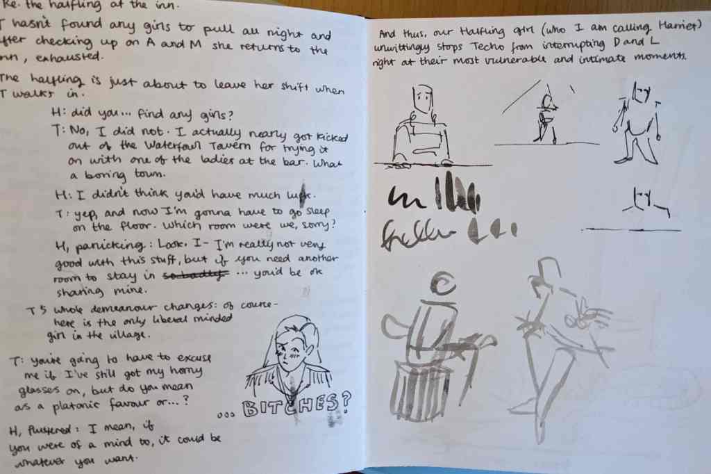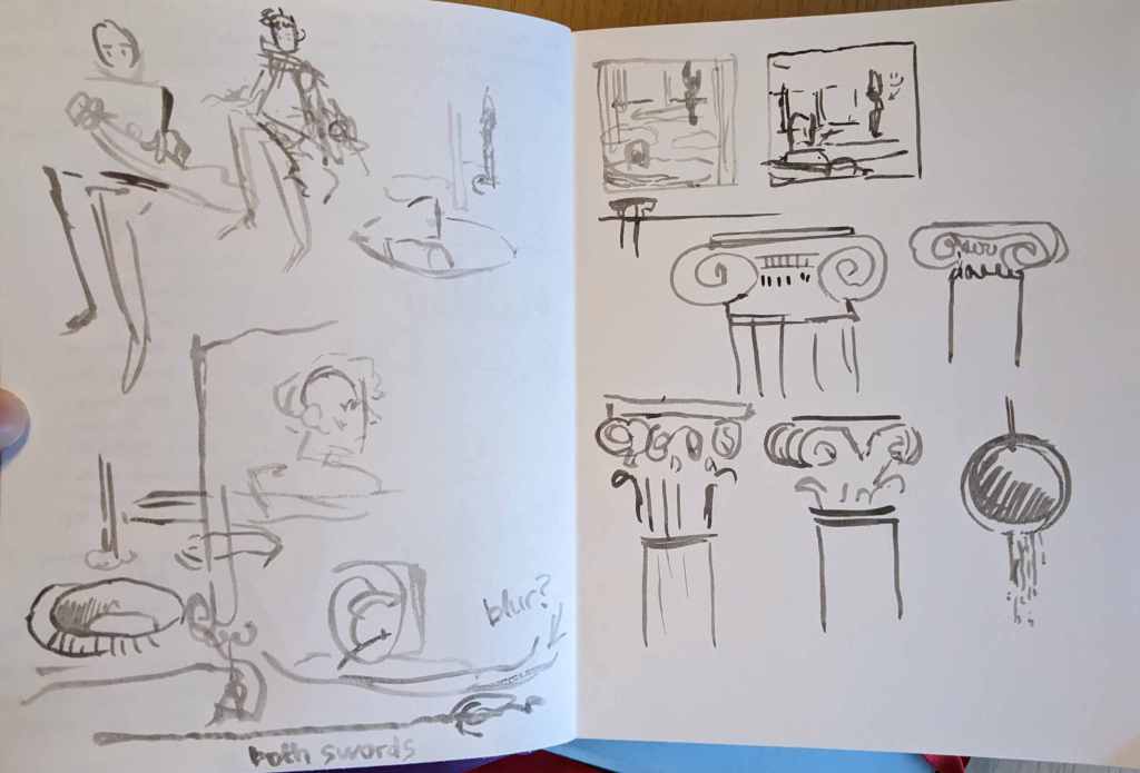 Here, you can see in the bottom right of this spread and top left of the next spread I figured out Antonia’s pose as she speaks to Whackus Bonkus. Key points I needed to showcase were hand casting light (for interesting lighting point), sword on lap. This meant slightly top down perspective to showcase the sword best. Toyed with an over the shoulder shot but I preferred the frontal shot. Makes you feel like you’re watching her more intimately.