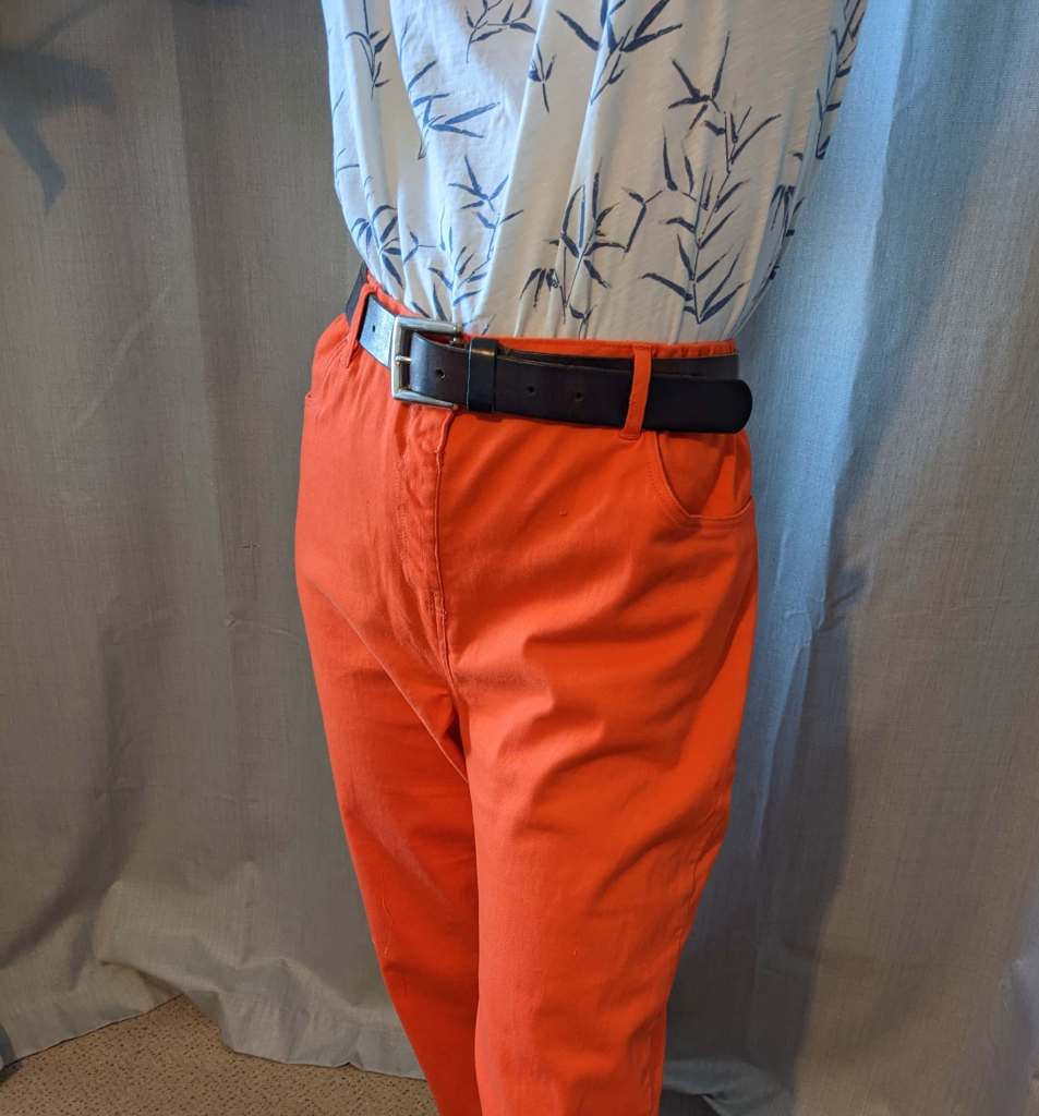 I took in both sides and also the back, because so much alteration was needed. I managed very sexily to sew the belt on the opposite side to the leg, which I’m sure is just a time-old mistake that everyone makes. I unpicked and resewed it carefully. I also unpicked two belt loops that had been lost to the alteration and re-sewed those onto the outside. The jeans still require a belt for two reasons. One, because I like belts. Two, because the fly is actually fake, and there needs to be enough give to yank them down and up over my hips.