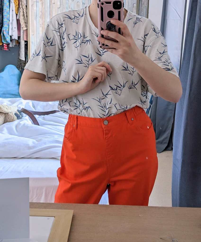 At Oxfam the other day I found a pair of eye-meltingly orange jeans for £5.95. The only problem was, they were a huge size 14. Such problems no longer matter to me, since I own a sewing machine! Below are befores and afters.
