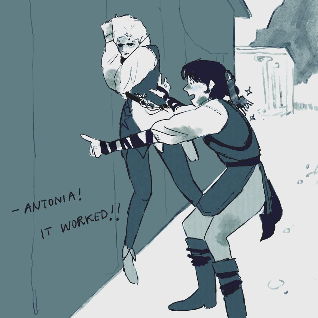 I think I’ll probably upload my writing on here in full today, because I need you to know that every second I’m not illustrating, I’m writing, or sewing, or painting, or thinking. And I don’t want the fact that I find time to write ten thousand words in the middle of university crunch time to go underappreciated. Also, it’s good writing. But here, I include the relevant excerpt for this illustration.